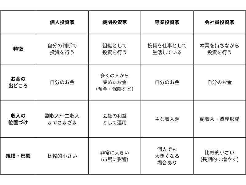 投資家と一言で言っても、その働き方や立場はさまざまです。
